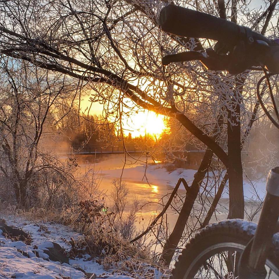 Gorgeous morning sunrise on a crispy-18C morning ride. A river of fog, filling the Elbow River