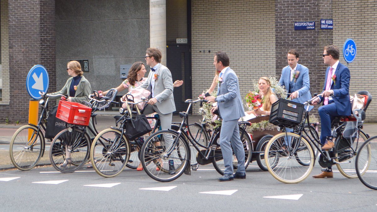 We'd spent less than five minutes on the streets of Amsterdam when we stumbled across a wedding party, complete with bride in the bakfiets!pic.twitter.com/Gm82Ymi81A