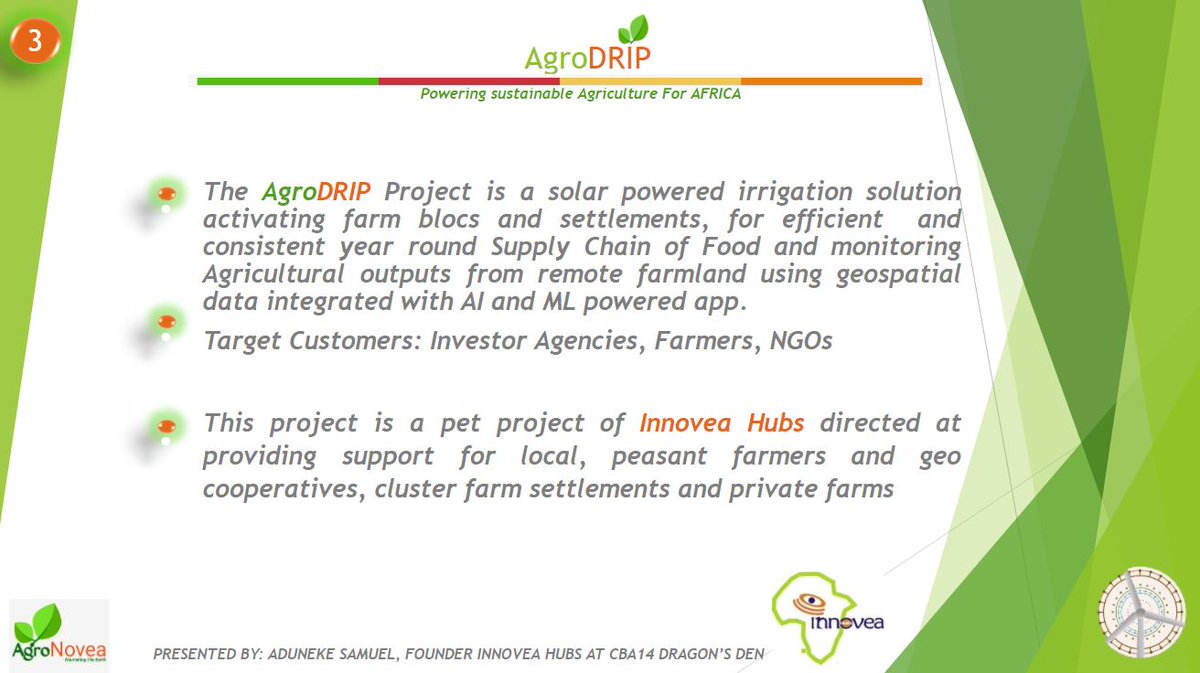 The third #CBA14 Dragon's Den pitch came from @AdunrekeSamuel of @InnoveaHubs Nigeria with the 'AgroDRIP' solar-powered irrigation project.pic.twitter.com/d0OtoVxDUu