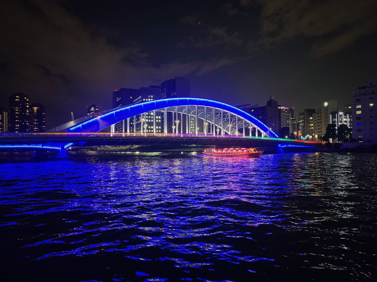 #永代橋 の照明がリニューアル。 とても綺麗でした。 欄干部分はレインボー。ブルーもちょっと派手なくらい綺麗でした。#深川#江東区#隅田川#隅田川でつながりたいpic.twitter.com/OkZCPtLGNK