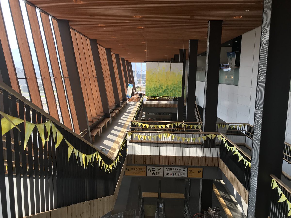 飯山駅に緑のカーテンが出現! 伝統工芸品である内山和紙を使っています。 これから徐々に、写真下の手すりにも緑のガーランドを取り付けて、飯山駅を緑にします! 取り付け作業は暑くて汗だくでしたが!笑 涼しげな緑がとってもキレイです☺︎pic.twitter.com/w0FAjf5gdP
