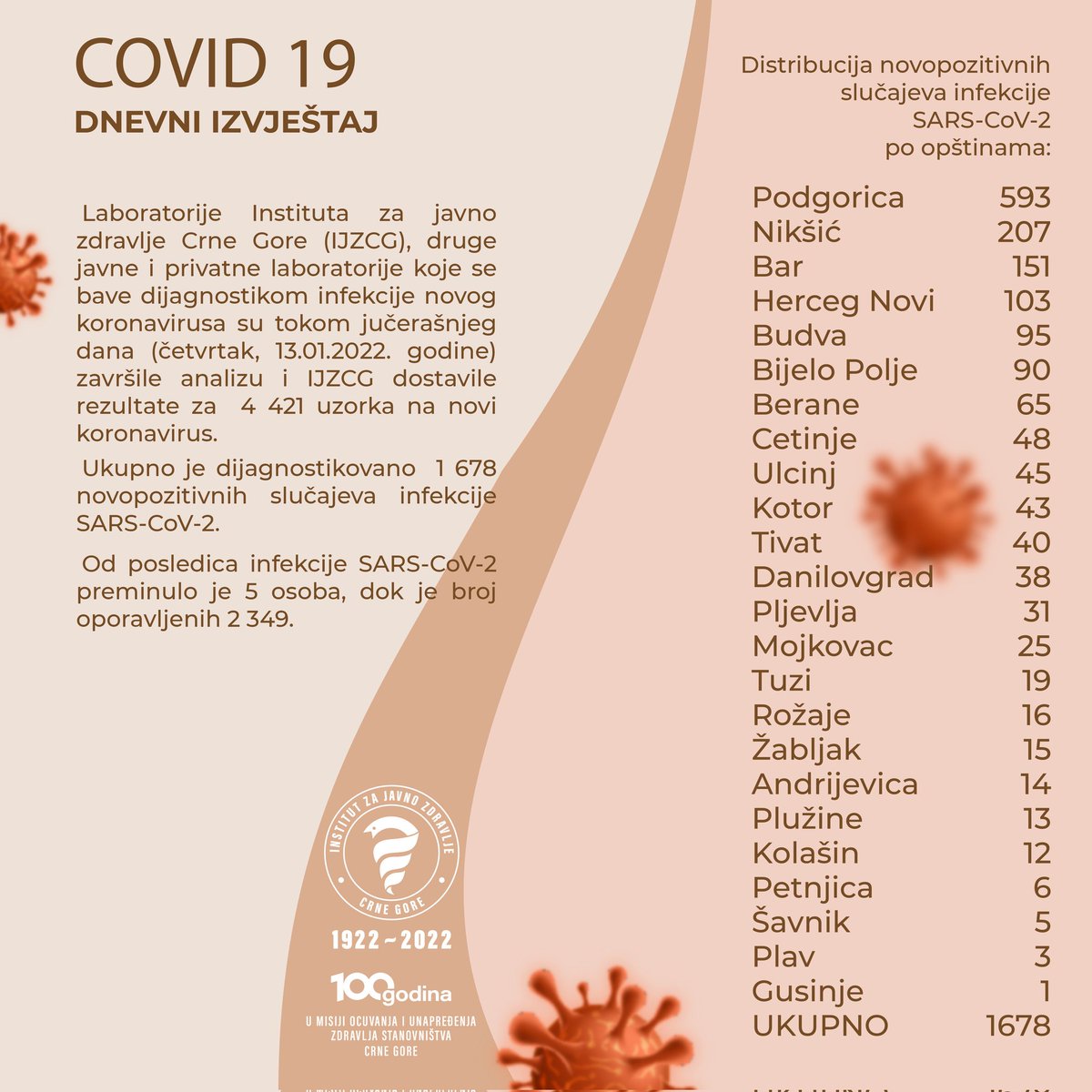 Konferencija za medije, povodom trenutne epidemiološke situacije u zemlji, izazvana pandemijom virusa #COVID19, održaće se u srijedu, 12.januara 2022. godine, u 10 sati u amfiteatru Instituta za javno zdravlje.