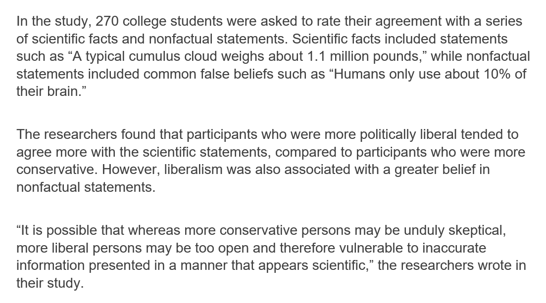Liberals are more accepting of scientific facts – and nonfactual statements https://www.psypost.org/2019/12/study-finds-liberals-are-more-accepting-of-scientific-facts-and-nonfactual-statements-55090 … via