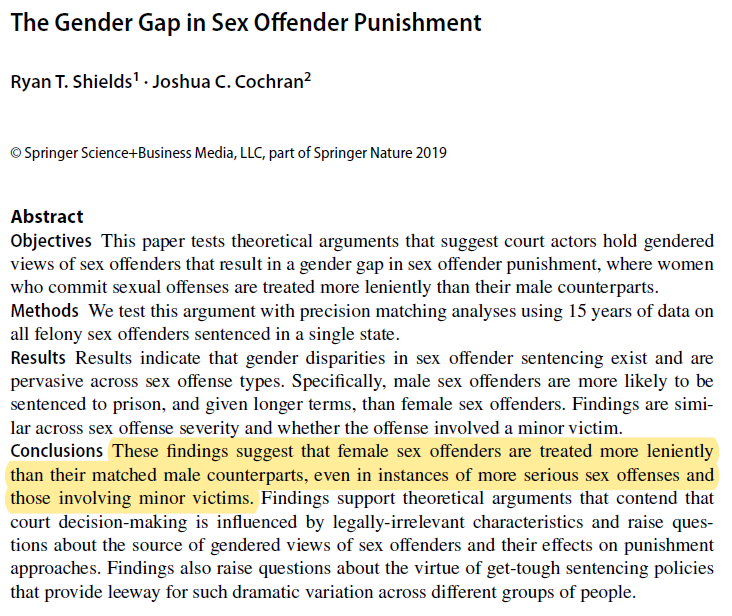 The Gender Gap in Sex Offender Punishment https://www.researchgate.net/publication/333518551_The_Gender_Gap_in_Sex_Offender_Punishment … "[F]emale sex offenders are treated more leniently than their matched male counterparts, even in instances of more serious sex offenses and those involving minor victims."pic.twitter.com/JKd5snNqr5