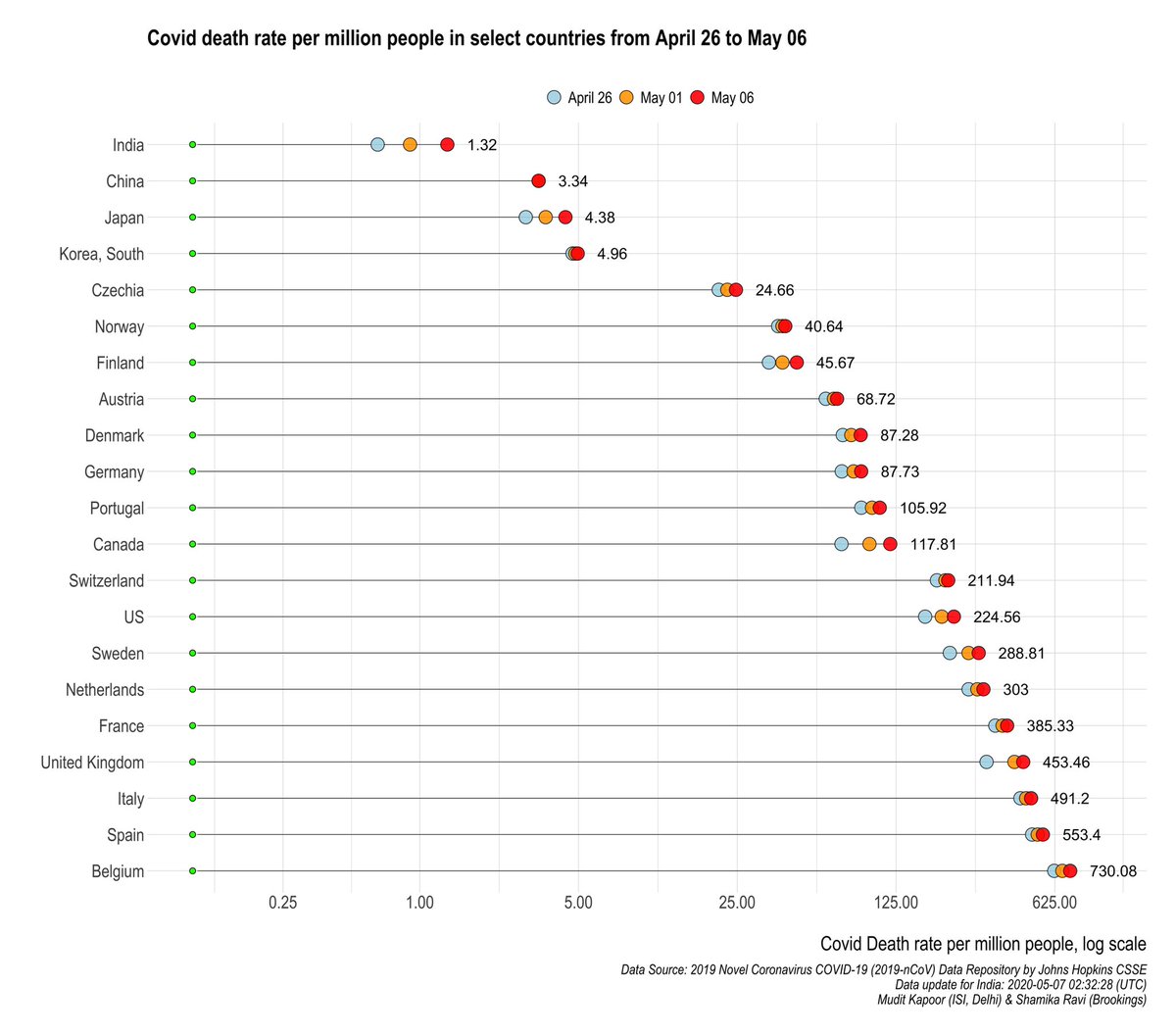 What are people's theories of Japan *and* India? Yes, I know both undercount and Japan wore masks. But no real lockdown in Japan, no mass testing in either but both are so much better than NYC or Lombardy, even weeks after lockdowns. What theory explains both Japan and India? https://twitter.com/Pinboard/status/1258363452889772034 …pic.twitter.com/ca0h3g7tZq