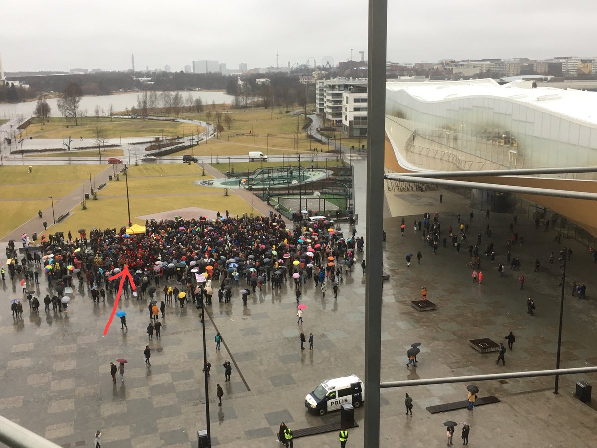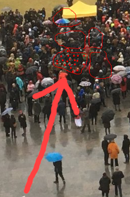 Tein laskelmia. Merkitsin noin kahdenkymmenen ihmisen joukkoja. Tuossa kuvassa on ympyröity 5 kpl sellaista joukkoa, eli 100 ihmistä. Nuoli osoittaa joukot (edit). Saattaa tuossa joukossa yhteensä tuhat ihmistä olla.pic.twitter.com/NyZ2kIAfDt