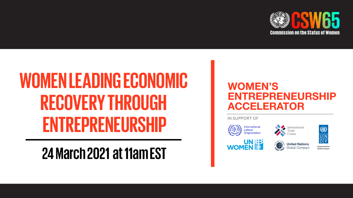 #CSW65 side-event on “Women Leading Economic Recovery through Entrepreneurship” on 24 March 2021 at 11am EST. Hear from@ILO's@MarthaENewton and speakers from@UN_Women,@ITU,@ITCnews,@UNDP and@MaryKay. Register at: https://unwomen.zoom.us/.../reg.../WN_w0oZifApTKmY89HMtRgUtg …pic.twitter.com/jDMym2xrkH