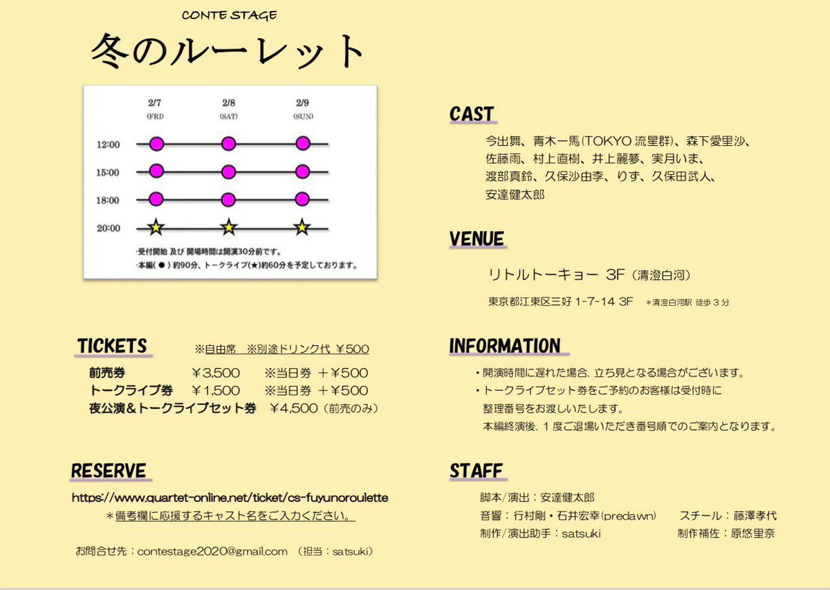 #冬のルーレット おかげさまで 2/8(土) 18:00〜が【#完売】となりました。 ありがとうございます。#当日券 のご用意、若干数ですがございます。 その他の回もお座席少なくなっておりますので、お早めのご予約をお願いします。 ▶︎ご予約 https://www.quartet-online.net/ticket/cs-fuyunoroulette …pic.twitter.com/OQkqU558Y8