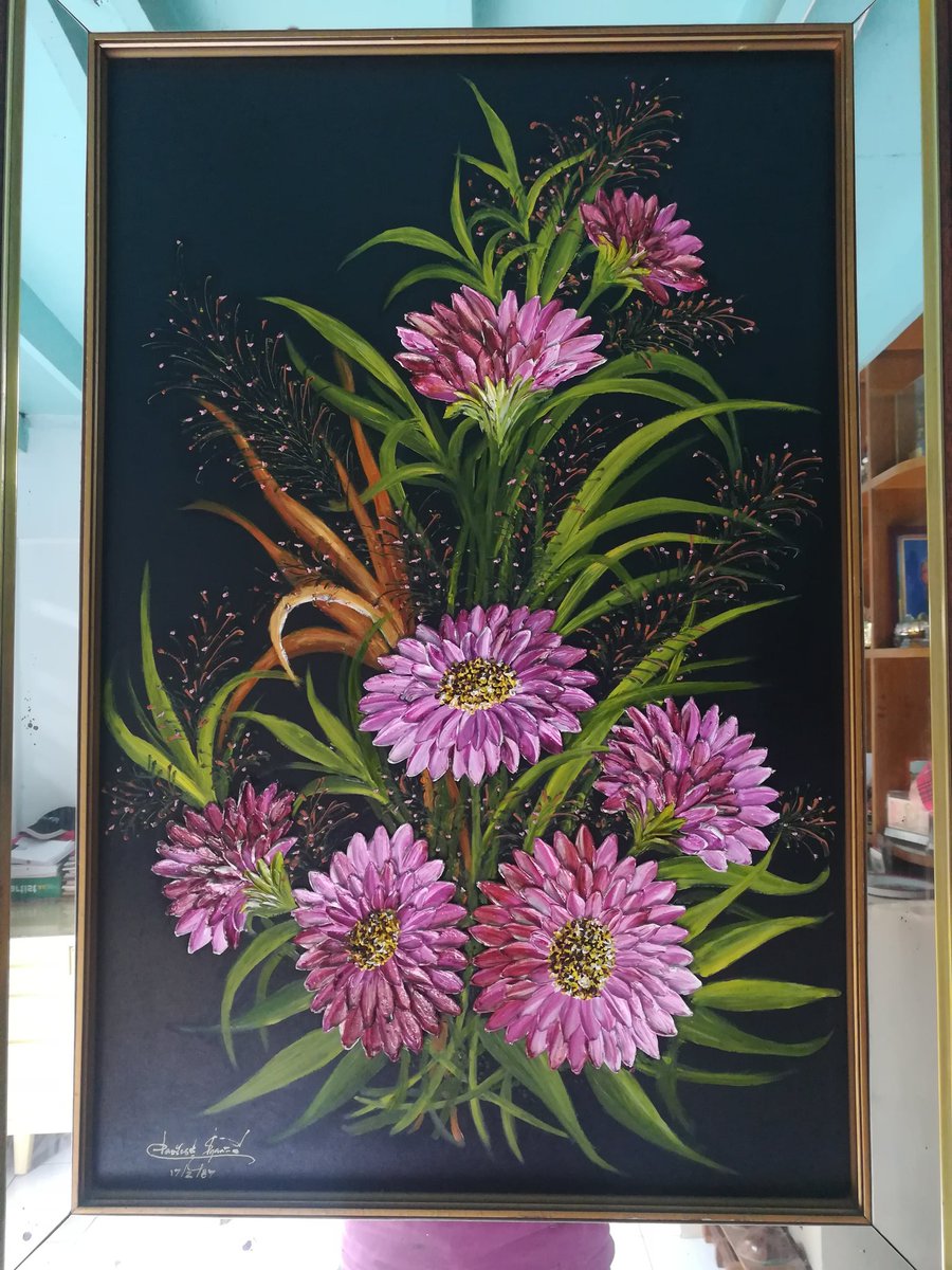 วันนี้ไปไหว้ตรุษจีนบ้านอาโกว อาโกวชอบวาดรูปดอกไม้ มีแขวนเต็มผนัง ไม่รู้เทคนิคนี้เรียกอะไร แต่เป็นเทคนิคที่เปลืองสีน่าดู ปาดเป็นก้อนๆเลยpic.twitter.com/g2AaYHbOnp