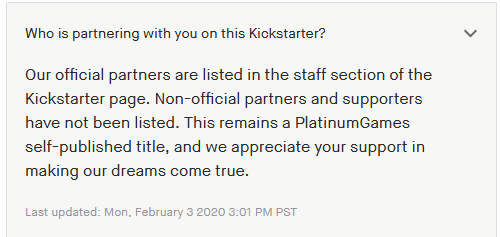 Platinum updated their Kickstarter FAQ to, I guess, insinuate that Dangen isn't involved but not outright say it. Or to say they're an unofficial partner? It's unclear.pic.twitter.com/p7bLcJxiXe