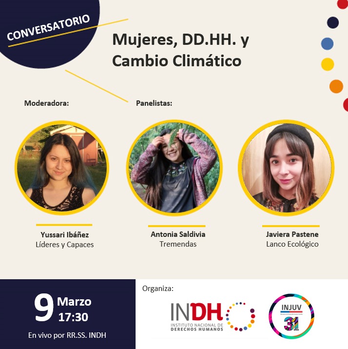 No te pierdas el Conversatorio "Mujeres, Derechos Humanos y Cambio Climático" organizado por INDH Los Ríos junto a @INJUVLosRios, en el marco del#8M.#8DeMarzo#IgualdadEnSeriopic.twitter.com/ZpihJyl21e