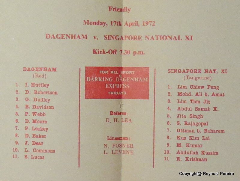 Dagenham v Singapore. That's right. Look at the team sheet. 1972. Where was it played? Who won? I'm staggered by this.