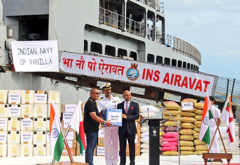 India stands with Madagascar: The Prime Minister, H.E. Christian Ntsay of Madagascar accepted the relief materials from Ambassdor Abhay Kumar in presence of Commander and officers of INS Airavat at a brief function held at Antsiranana in