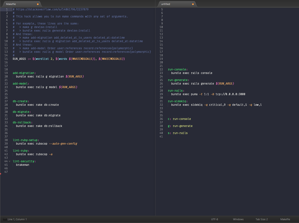 #прокод Есть лайфхак. Использовать make-команды при локальной разработке. Здорово облегчает жизнь. О подходе я узнал лет 5 назад от Кирилла (https://www.youtube.com/watch?v=pK9mF5aK05Q …), с тех пор использую. Вот мой Makefile, подходит для разработки на Ruby on Rails: https://gist.github.com/gambala/4874e2b41a52ac043a274a61f5d7726b …pic.twitter.com/snERePdk9V