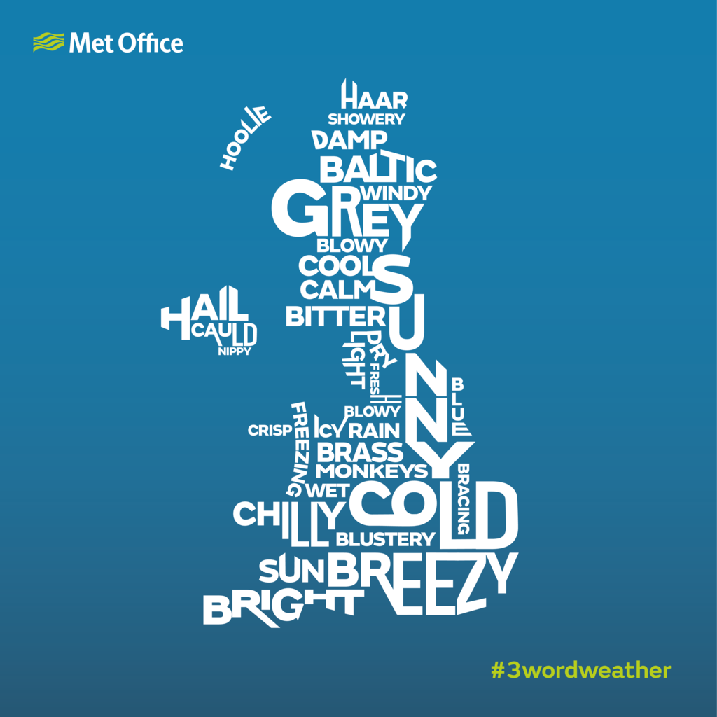 @metoffice weather campaign, have you? Tweet your three words and nearest city with the hashtag#3wordweather to see your tweet on our live map. See which words people have been sending in here: http://3wordweather.informaticslab.co.uk/Thanks. Twitter will use this to make your timeline better. UndoUndo -