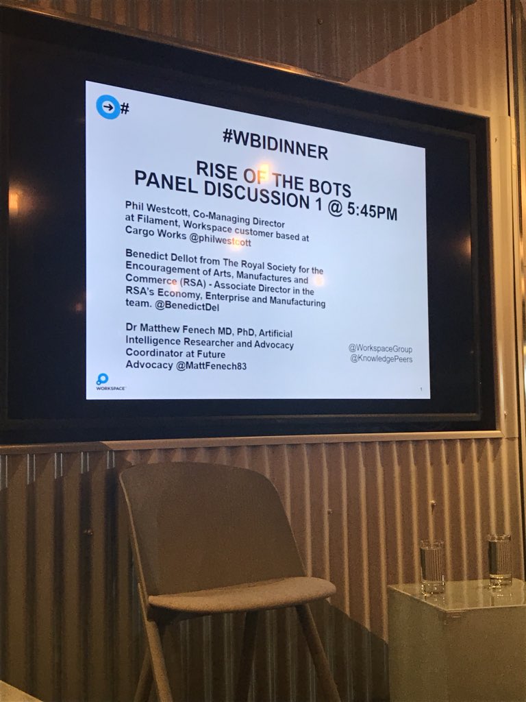#Riseofthebots@WSLeathermarket#WBIDinner is between@RMcElearney Conversational Interfaces Lead@FilamentAI@_JacobTomlinson Lead Engineer@informatics_lab &@Thetechstyler Co-Director@BRIAukpic.twitter.com/QZntkvQHrx