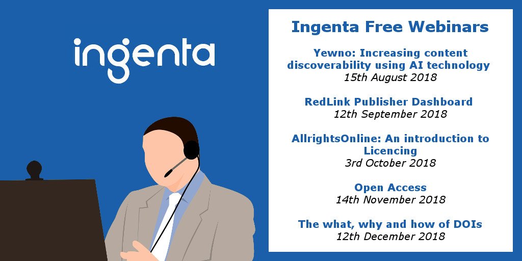 #Publishers and#researchers register today for our latest#Ingenta FREE#webinars. We’ll discuss@DoYewno#AI,#MachineLearning,#discovery,@_RedLink Publisher Dashboard,#OA,#licencing and the#digital object identifier,#DOI. http://bit.ly/Ingentaevents pic.twitter.com/RbHSbNHzNo