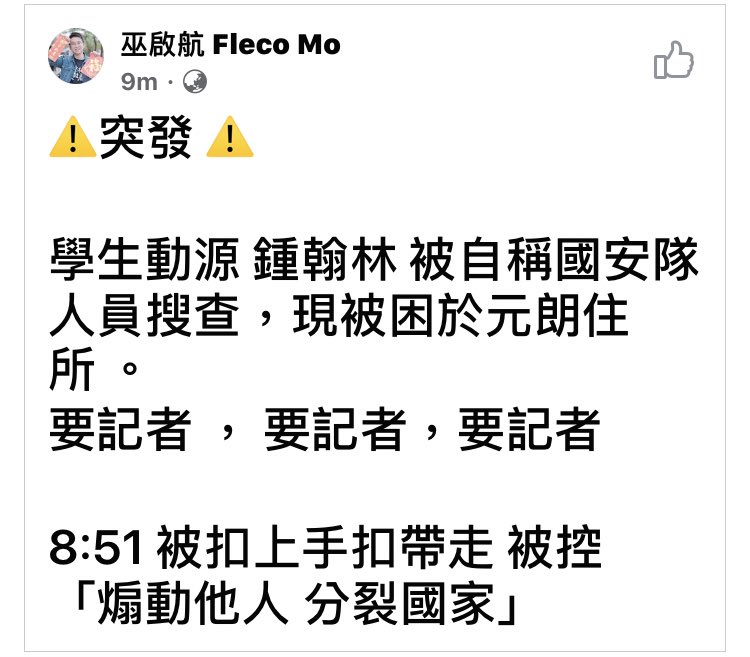 Tony Chung, convener of the now disbanded pro-independence group Student Localism was just arrested in name of “inciting subversion of state”. It is reported that State Agents are involved in the process. #NationalSecurityLaw pic.twitter.com/uWusH8q95t
