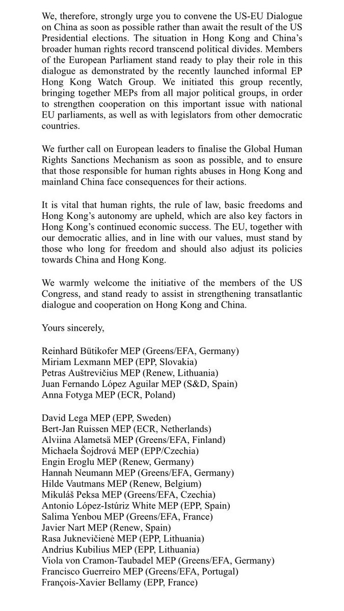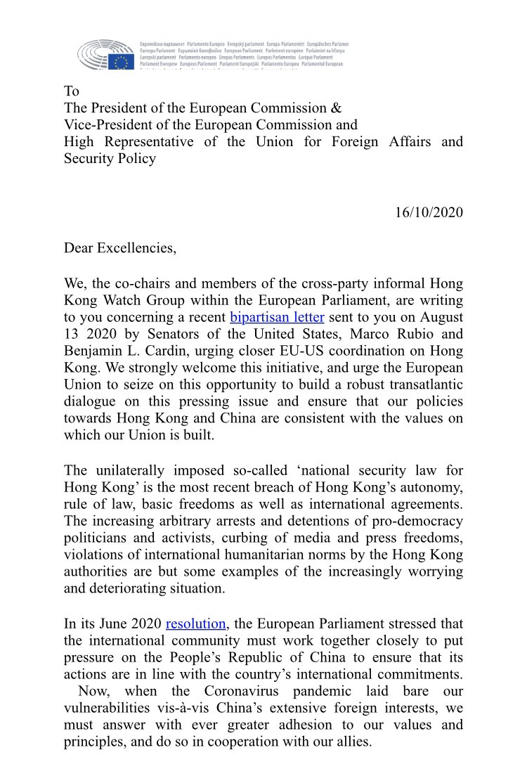 MEPs join letter to the President of the European Commission calling for closer EU-US coordination on responding to China's crackdown in Hong Kong.