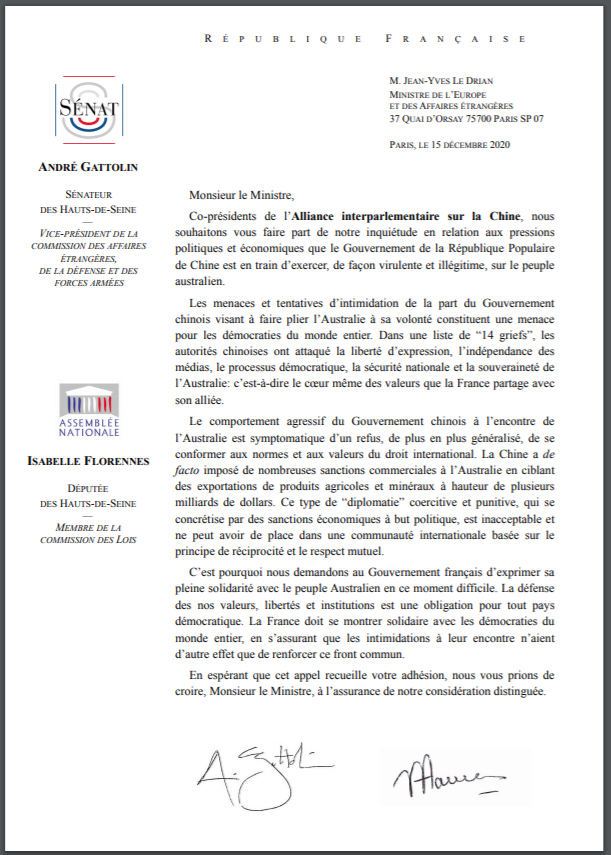 Text of the original letter from Sen. @AndreGattolin and @iflorennes92 MP to Minister for Europe and Foreign Affairs @JY_LeDrian.https://twitter.com/ipacglobal/status/1338791959259983875 …