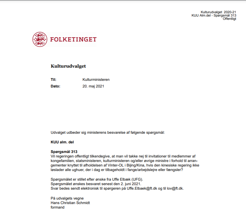 @uffeelbaek MP has submitted a question to the Minister of Culture asking for the government to publicly state that members of the royal family and government should decline invitations to attend the Games. https://www.ft.dk/samling/20201/almdel/kuu/spm/313/2398042.pdf …pic.twitter.com/wapHz48z3z