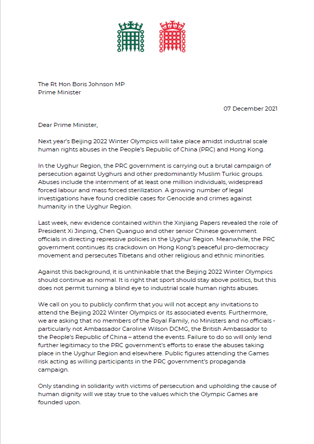 #BREAKING: UK PM @BorisJohnson announces diplomatic boycott of #Beijing2022 Winter Olympics.