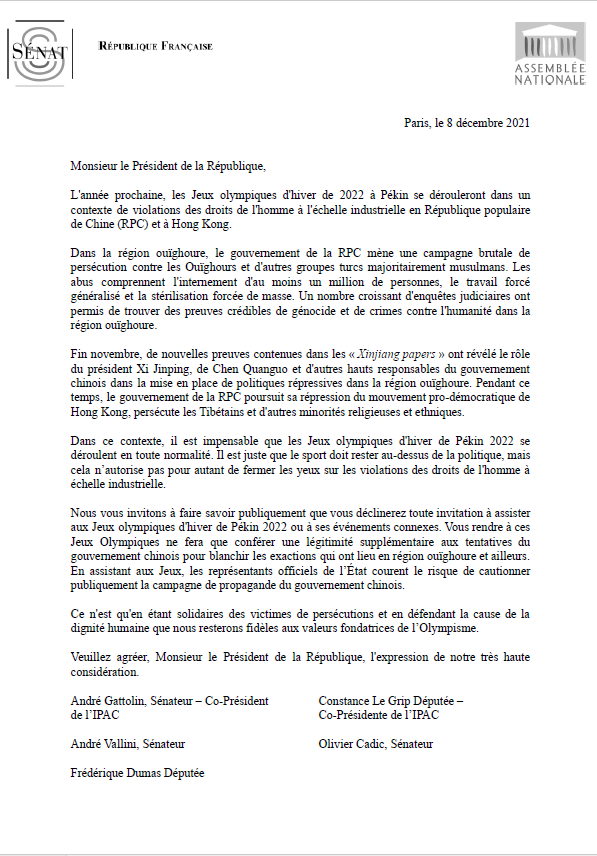 parliaments calling for #NoRightNoShowhttps://www.liberation.fr/international/asie-pacifique/des-parlementaires-francais-monsieur-le-president-declinez-linvitation-aux-jo-de-pekin-20211208_HUEL2HI5TZD7TJZ7NIXXFEYHPU/ …