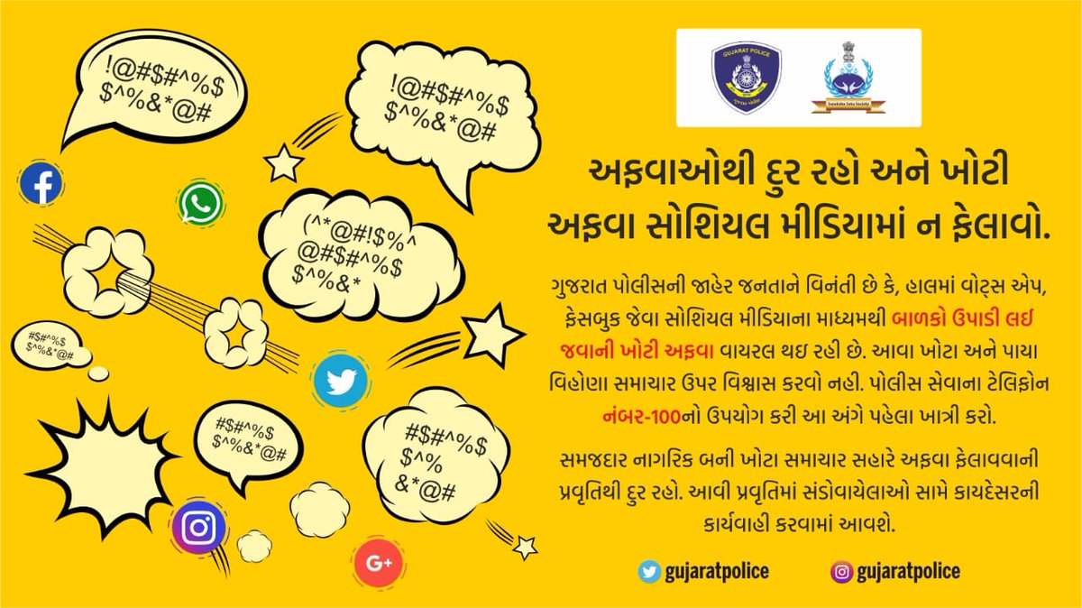Issued in public interest by Gujarat Police: There is no truth in rumours pertaining to child-kidnapping gangs. Do not believe in such rumours and dial 100 to confirm and to help police in identifying rumour-mongering miscreants.