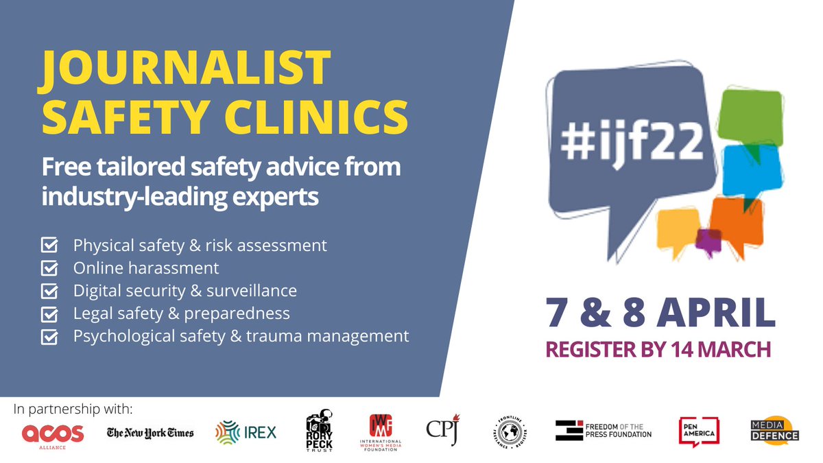 Safety experts from @IWMF@pressfreedom@FreedomofPress@mediadefence@nytimes@PENamerica@IREXintl@rorypecktrust & more will be at@journalismfest offering free 1-2-1 safety clinics for independent journalists. Don't miss out! https://bit.ly/3JzLyc2 pic.twitter.com/VdFqM47sDV