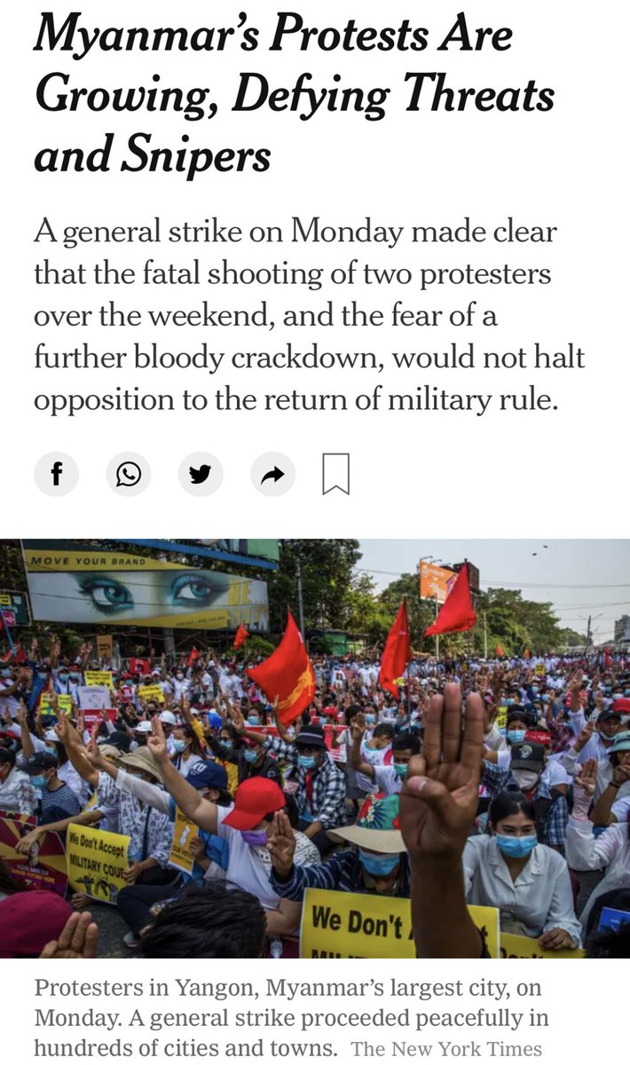 The pictures out of Myanmar are incredible. The guts of these people, up against way worse odds than us. The military has begun sniping demonstrators but the general strike is onpic.twitter.com/pZIY9LjYcn