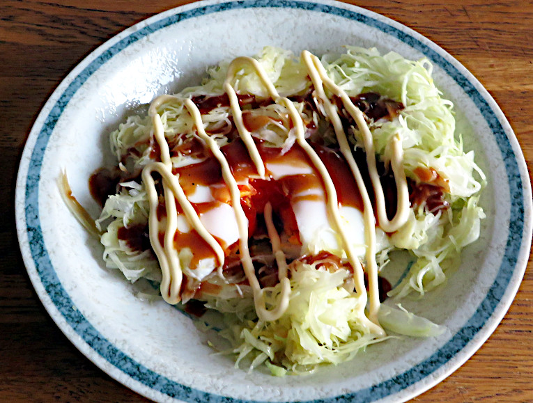 #キャベツ 消費中。残り2玉。 千切りキャベツにタマゴを乗せて蒸し焼きにした「巣ごもりタマゴ」。 味付けはソースとマヨネーズ。 なんとなくお好み焼きっぽさが漂う。pic.twitter.com/S5ux7YvC1L
