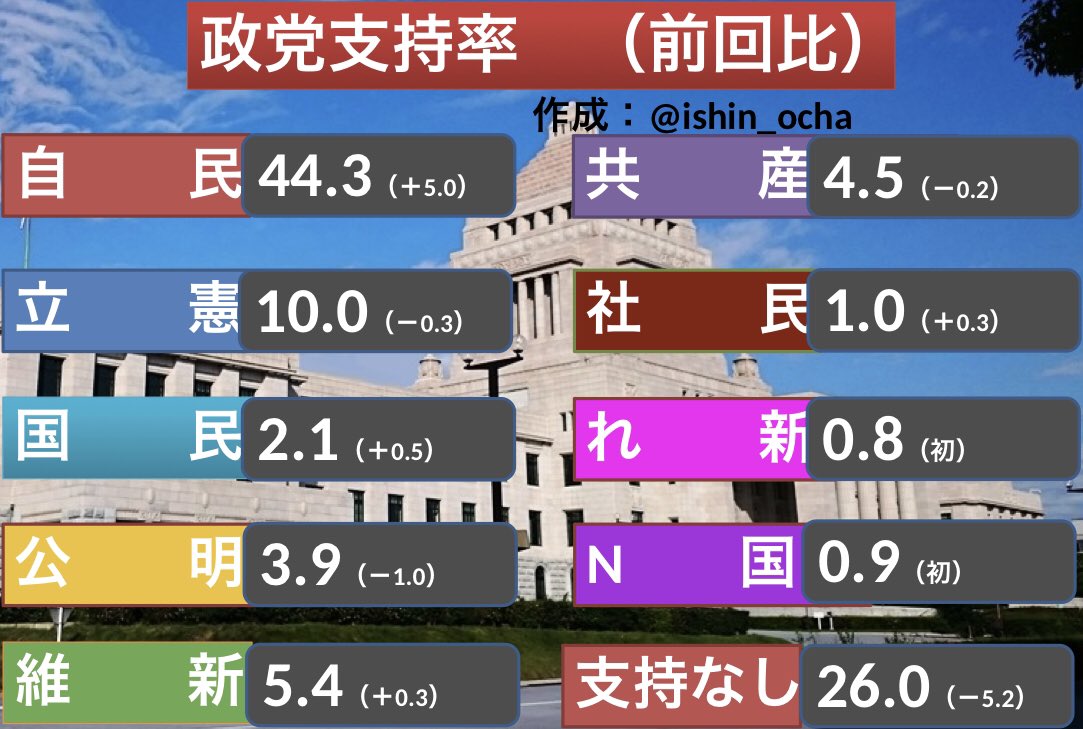 先日話題となったれいわ新選組の伸びが今回のANNでは見られませんでした。N国の健闘、自民党の支持率増加以外は目立った変化は見られません。