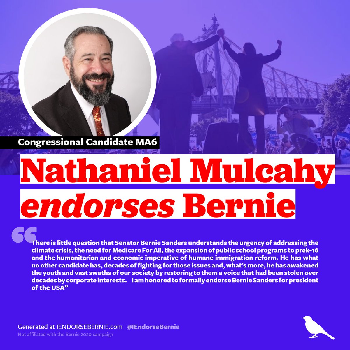 #IEndorseBernie generator on#Mulcahy2020! Nathaniel Mulcahy, Democratic congressional candidate for#MA6 endorses@BernieSanders for President!pic.twitter.com/dEYqKoFAte