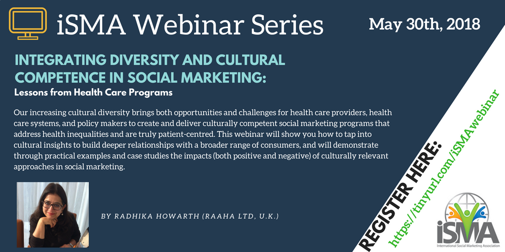 Registered for our upcoming #iSMAwebinar yet? Join us for a talk on integrating diversity and cultural competence in social marketing. Not an iSMA member? Sign up today and access our webinar for free! For more info and registration: http://tinyurl.com/iSMAwebinar pic.twitter.com/nPtIX61OWw