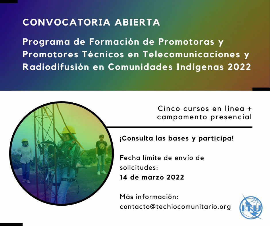 Les compartimos con mucha emoción que abre una nueva edición del "Programa de #Formación de Promotoras y Promotores Técnicos en#Telecomunicaciones y#Radiodifusión en#ComunidadesIndígenas", en el que colaboramos con@ITU