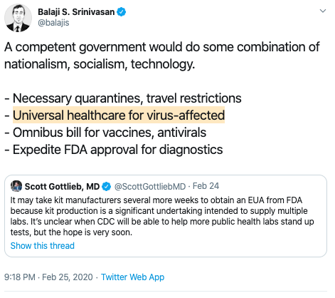 Balaji S. SrinivasanVerified account @balajisA competent government would do some combination of nationalism, socialism, technology. - Necessary quarantines, travel restrictions - Universal healthcare for virus-affected - Omnibus bill for vaccines, antivirals - Expedite FDA approval for diagnostics https://twitter.com/ScottGottliebMD/status/1231946561405509636 …Show this thread1 reply 0 retweets 1 like -