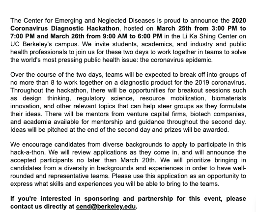 A 2 day hackathon in close quarters w/ other humans who will travel to and back isnt the move, especially when at least one student in UCB is confirmed for COVID19 maybe a virtual conference but this is ill advised.