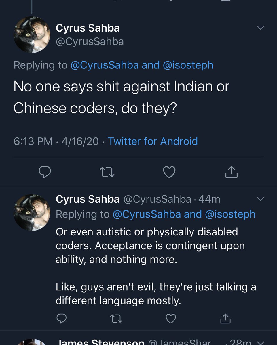 It's worse, we're only meritocratic when we think it benefits us. Default thought for many men: Man coder= they must be good to have gotten the job. Woman coder= they must have got the job because 'diversity'. Men=innocent until proven guilty Women=guilty until proven innocent