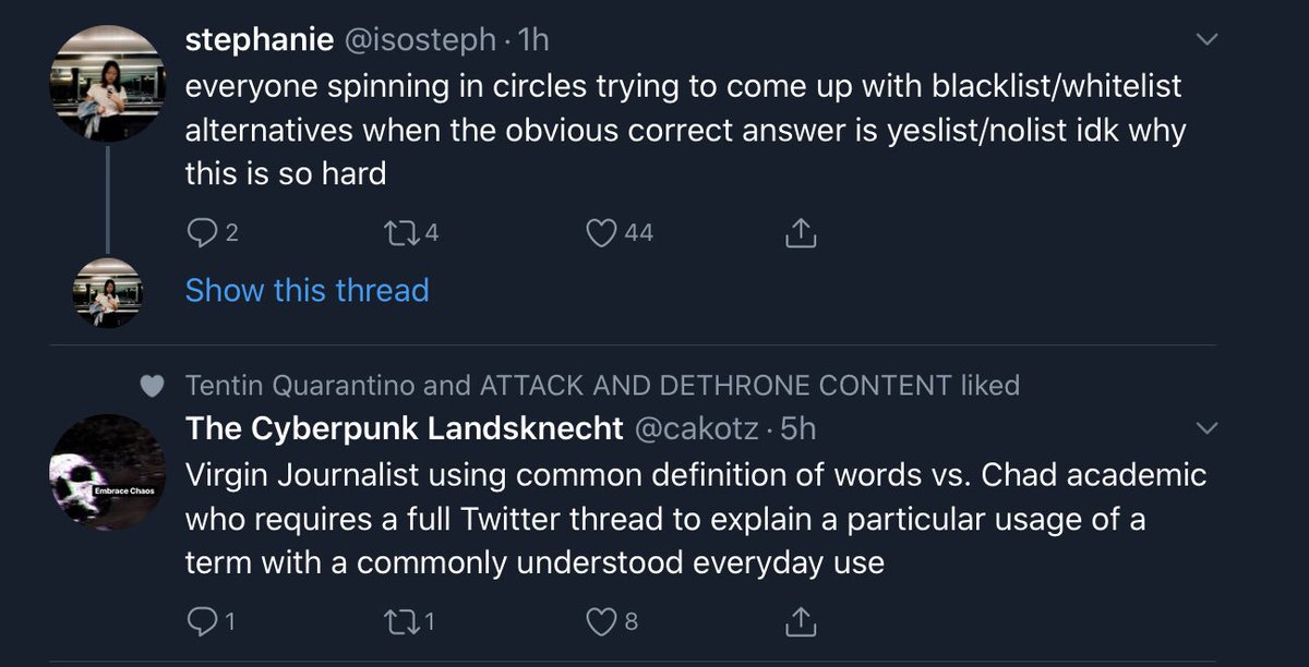 the fact that there are all these polls going around like allow/deny? pass/block? pass/deny? allow/stop? means there are too many fucking options and ur never gonna remember what each new codebase uses but yes/no? requires 1 brain cell to understand vote yeslist/nolist 2020