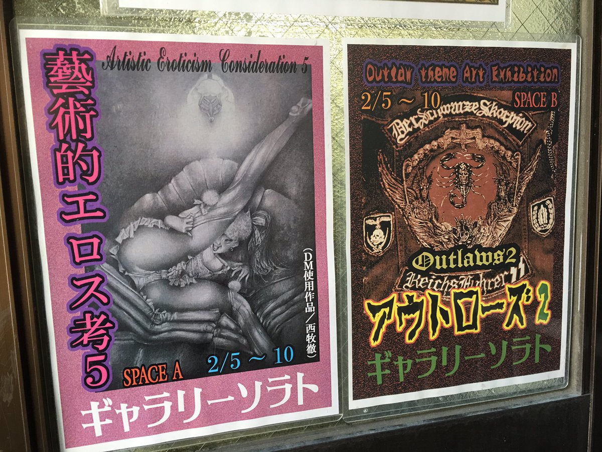 本日初日です!京都東山ギャラリーソラト Aスペース「藝術的エロス考5」 Bスペース「アウトローズ2」 今日は参加作家の翔にゃんさん、高田一樹さん、イソタサワゴさん、ウラジーミル・アスポンさんなどお越し頂いて盛況です!是非お越し下さい!pic.twitter.com/NgTkkhjeHm