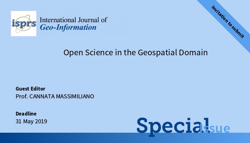 Our NEW Special Issue "Open Science in the Geospatial Domain" is online! Edited by Prof. Massimiliano Cannata @maxi_cannata Submission Deadline 31 May 2019. Welcome to contribute! More Details