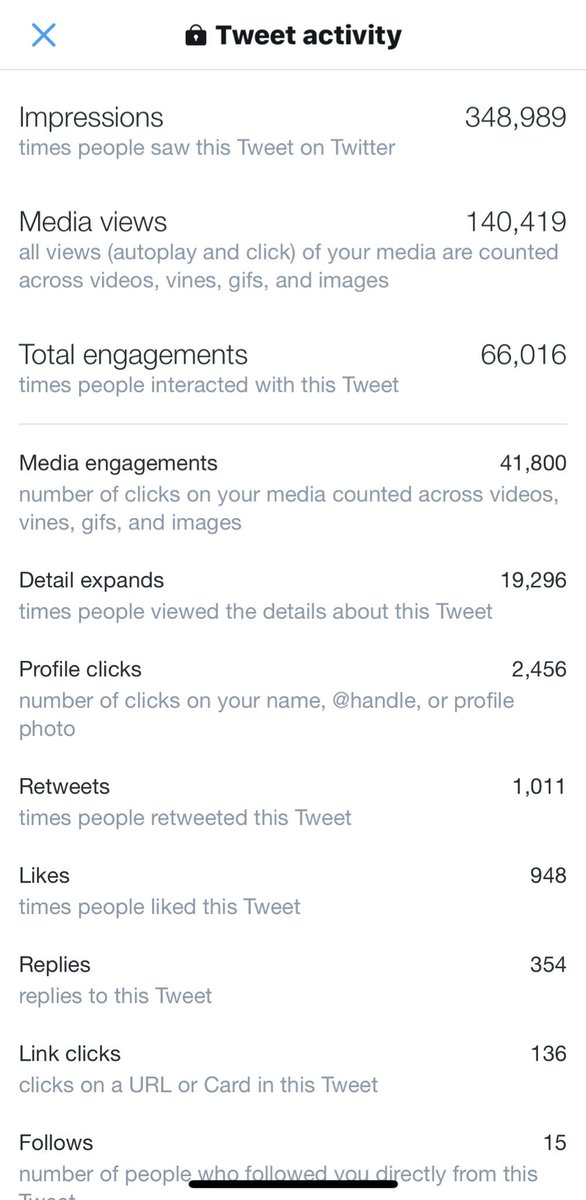 the most impressive numbers on there are the profile views and follows directly from the tweet. follows from a tweet alone are extraordinarily rare, so 15 from one is crazy, at least for me