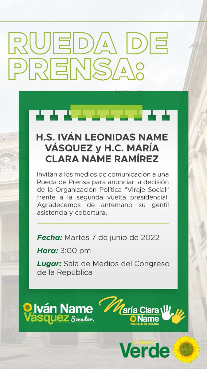 @MariaClaraName haremos pública la decisión de la organización Viraje Social, frente a la segunda vuelta presidencial@PartidoVerdeCoL Conectate en vivo por nuestro facebook Live https://fb.me/e/1XzR8fc3F pic.twitter.com/DyNe6917ewThis media may contain sensitive material. Learn more
