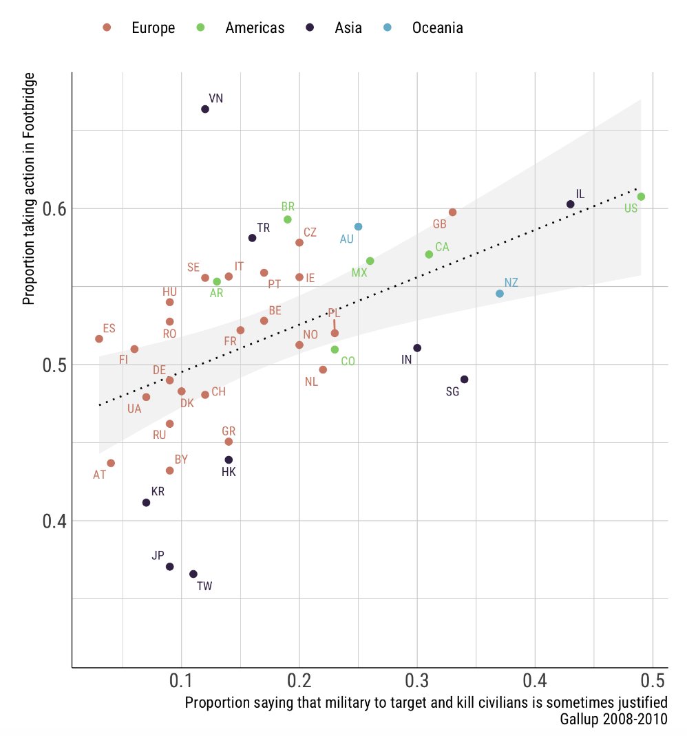 However, there were quantitative variations in the endorsement of sacrifice for the greater good, across cultures. Paper's appendix shows different cross-country correlates, such as individualism, religiosity, gross domestic product, and even tolerance to collateral damage in warpic.twitter.com/YBohgrZC5O