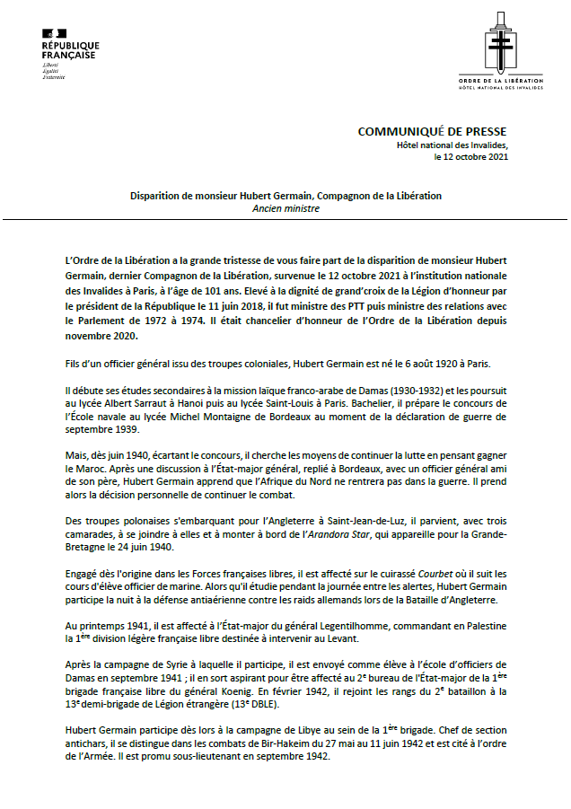 Geschichte schließt sich. Der letzte „Compagnon“ der Befreiung, # HubertGermain ist gestorben. 1038 Männer und Frauen, die sich um die Befreiung Frankreichs von der Nazi-Besatzung verdient machten,erhielten den Orden. 700 überlebten den Krieg. #ordredelaliberationhttps://twitter.com/O2LaLiberation/status/1447943841802301447 …