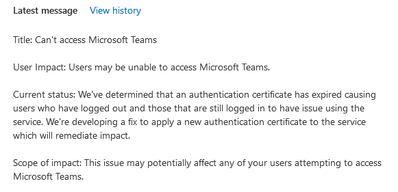 Microsoft Teams outage this morning. Guess Why? Certificate expiration. Automation, automation, monitoring, automation.pic.twitter.com/C3c4oErLGa