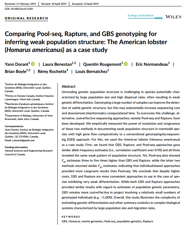 It's out ! check out my first PhD article - Comparing Pool‐seq, Rapture, and GBS genotyping for inferring weak population structure: The American lobster (Homarus americanus) as a case study. Look at in open access : https://doi.org/10.1002/ece3.5240 ….