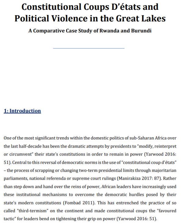 MA Thesis in International Relations by Jamie Wiseman at Leiden University: "Constitutional Coups d'Etats and Political Violence in the Great Lakes: A Comparative Case Study of