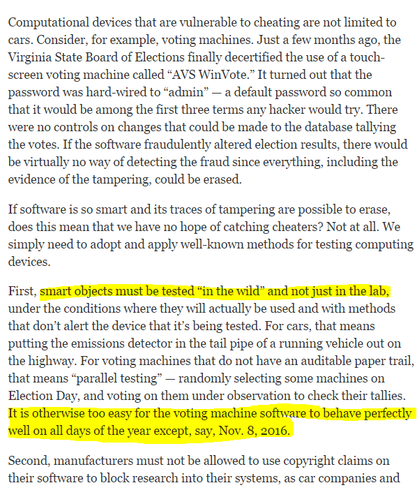 If cars cheat, what else? Voting machines? My NYT piece on the internet of cheating things. http://www.nytimes.com/2015/09/24/opinion/volkswagen-and-the-era-of-cheating-software.html …pic.twitter.com/1Cr7yPCfit
