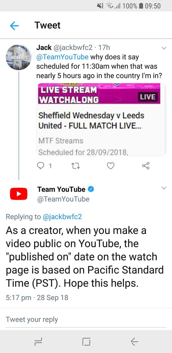 So @TeamYouTube tell me why scheduled streams are in pst time zone as I was wondering why scheduled videos are automatically in local time but scheduled streams aren't. But then they give me more details about scheduled videos when I didn't even ask them to 😂😂pic.twitter.com/FI0bqNO1td